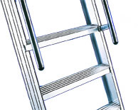 Scala d’appoggio a gradini profondi 10 cm saldati ai montanti, inclinazione 68°. A norme europee UNIEN131 e italiane D.LGS81/08