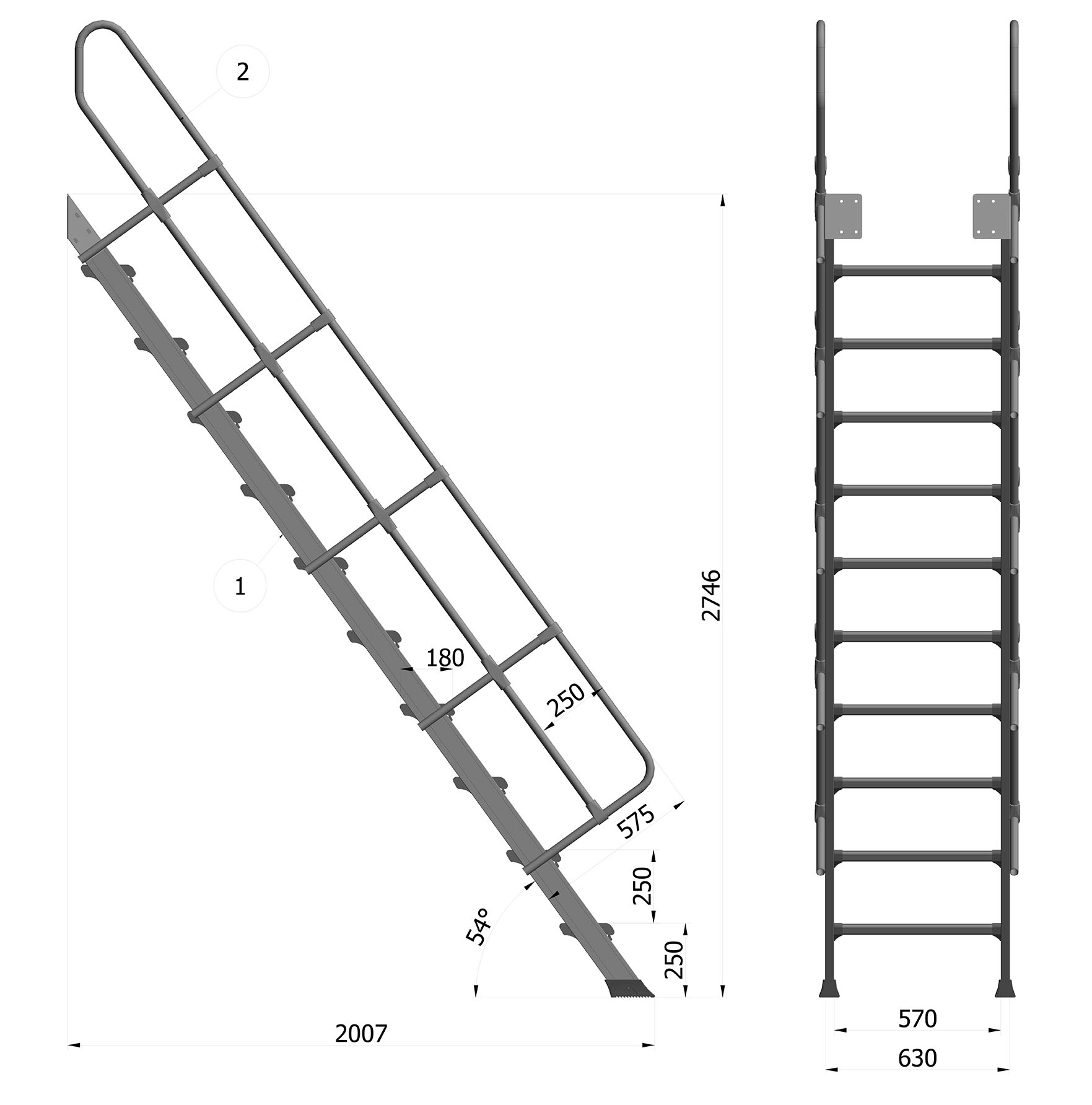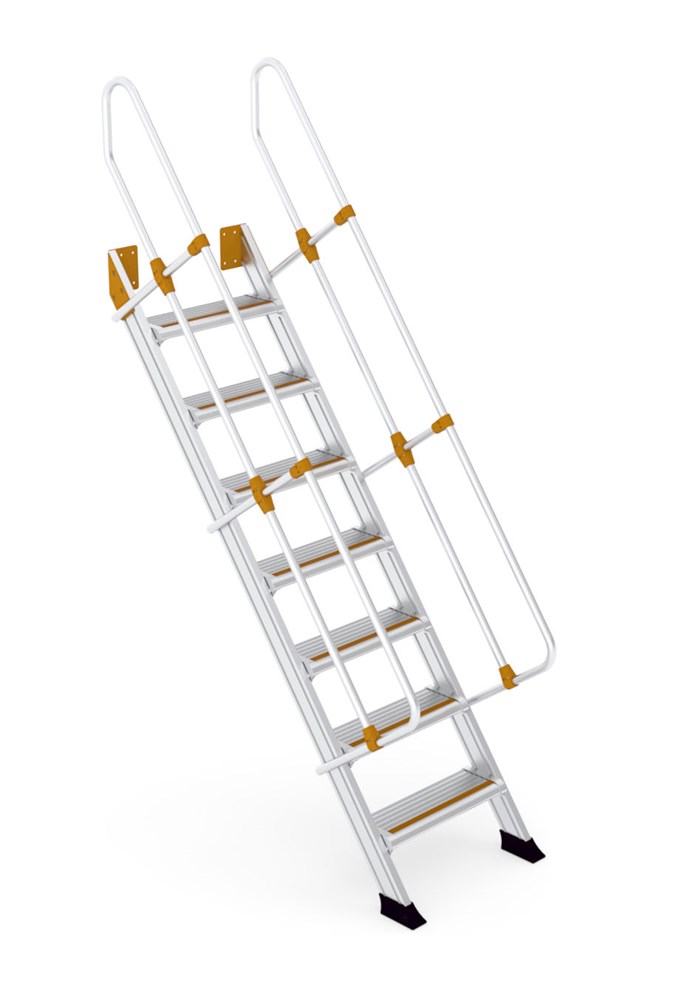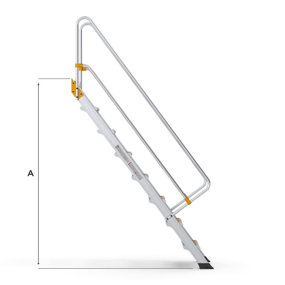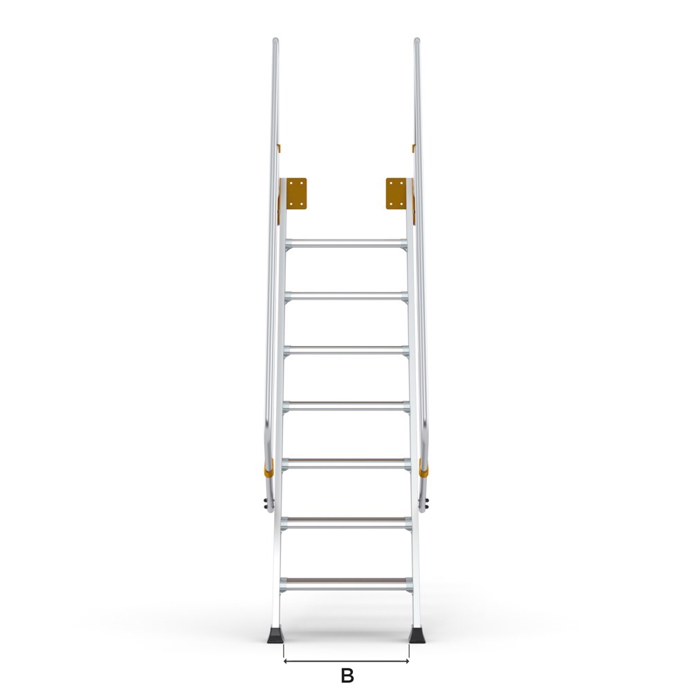 Scala d'accesso in kit di montaggio dotata di corrimani, piedi di appoggio e staffe di fissaggio a terra e al muro