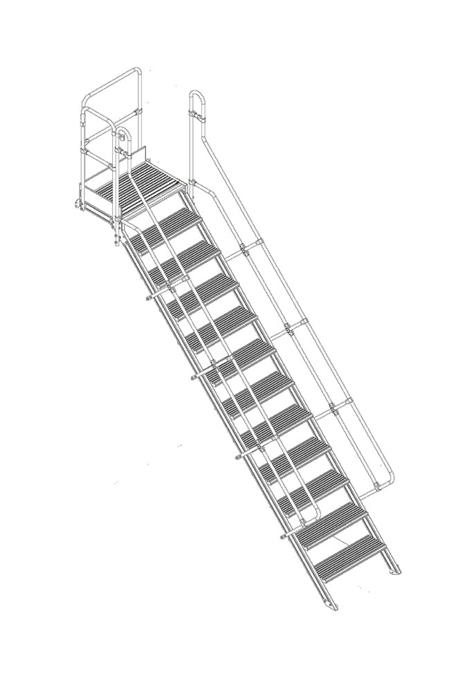 Scala di accesso a 46° in kit di montaggio con piattaforma e sbarco laterale destro o sinistro, corrimani, piedini di appoggio e staffe di fissaggio a terra e al muro