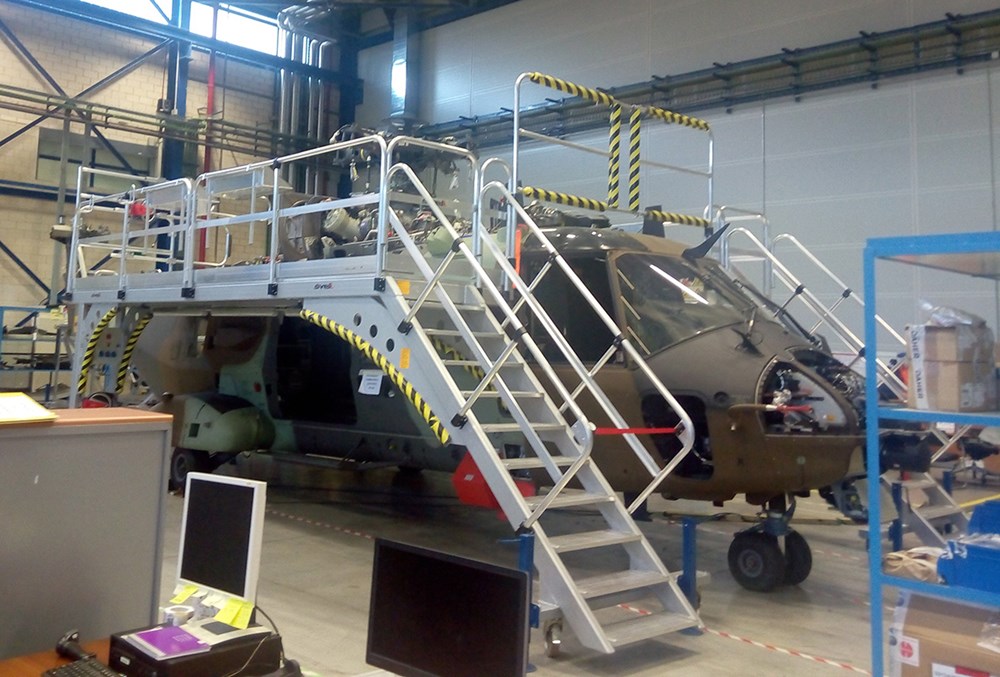 Strutture speciali di camminamento per lavorare su elicotteri, salita comoda, parapetti su lato esterno.