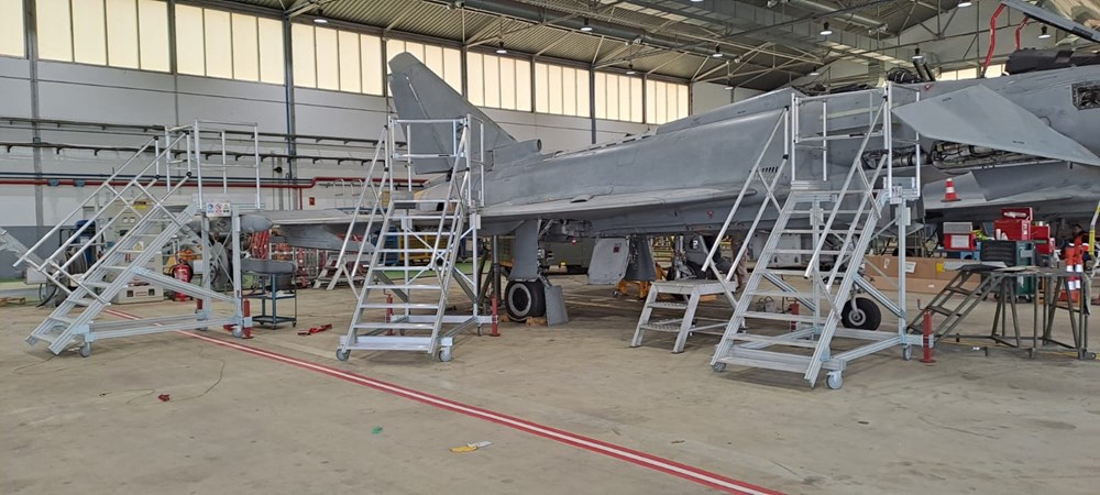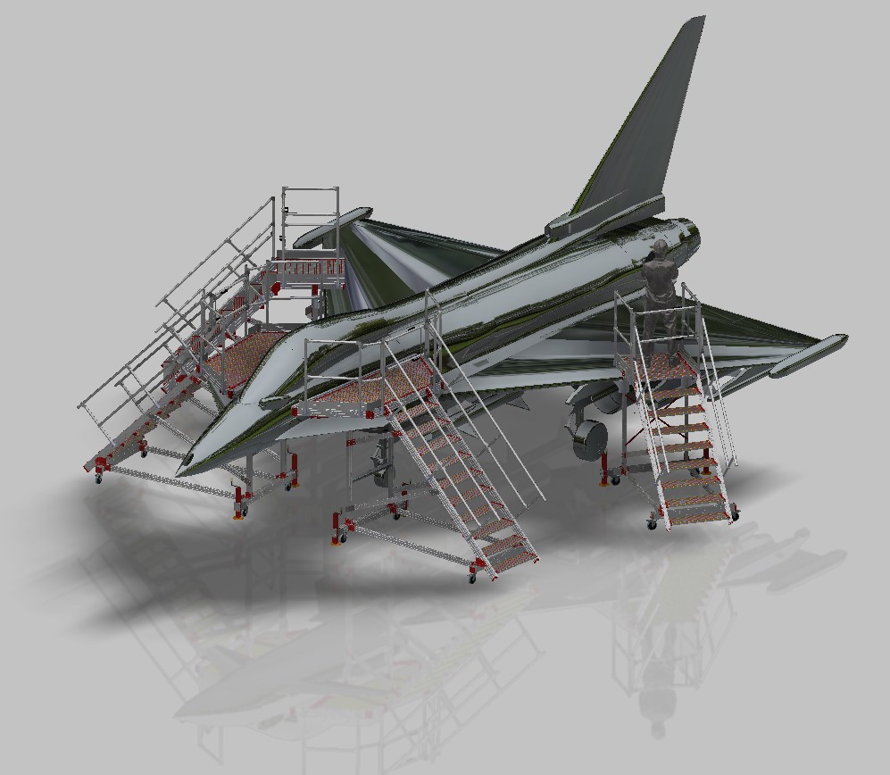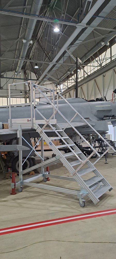 Fornitura di 2 scale di accesso del pilota, con sbalzo anteriore che segue il profilo dell'aereo, per poter accedere direttamente all'interno e allo stesso tempo effettuare operazioni di manutenzione sul lato della fusoliera.
