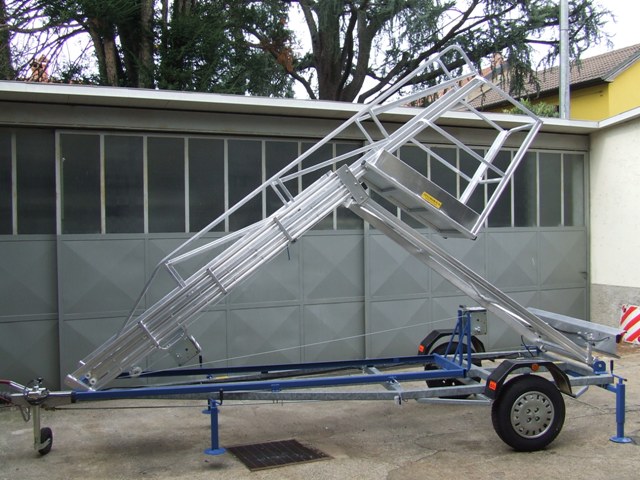 Il telaio in acciaio verniciato sostiene una scala in alluminio nervato con piattaforma completa di parapetti si tutti i lati e (su richiesta) di cancelletto di sbarco frontale.