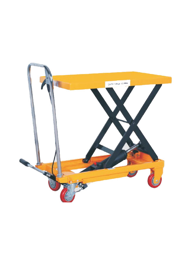 Piattaforma elevatrice trasportabile in acciaio con sollevamento tramite pompa a pedale. Altezza max mm 720