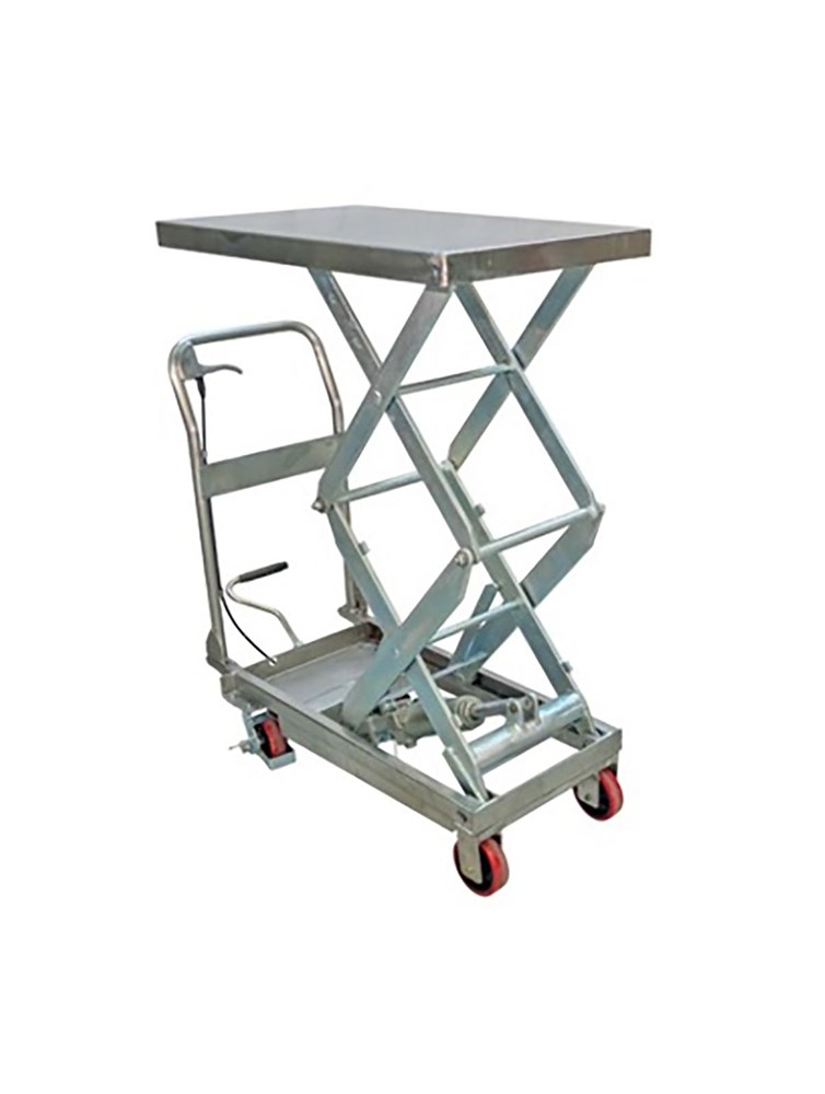 Piattaforma elevatrice trasportabile in acciaio inox con sollevamento tramite pompa a pedale. Altezza max mm 1295