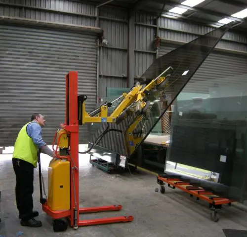 Consente ad un operatore di sollevare un vetro o un IGU da una rastrelliera o camion e poi inclinare il vetro rispetto all'asse orizzontale, e poi lentamente e precisamente abbassarlo su un tavolo o in una dima di taglio.