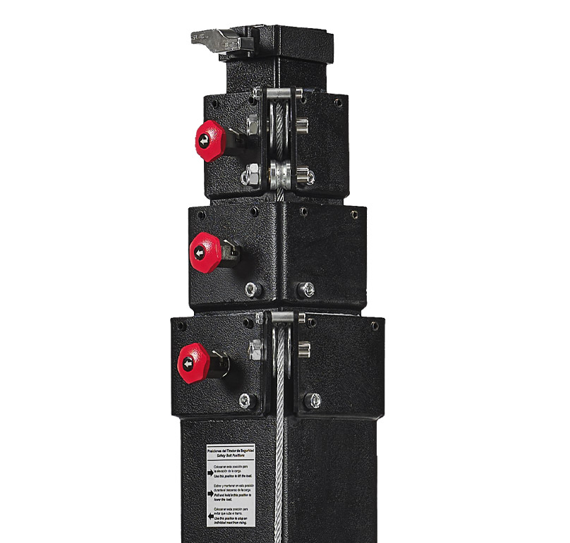 - Un blocco meccanico di sicurezza arresta la discesa incontrollata della colonna di elevazione in caso di rottura del cavo