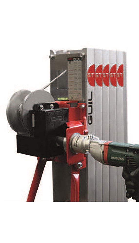 Dotato di 3 sicurezze: argano frenato, blocchi intermedi e freno anti-caduta automatico.