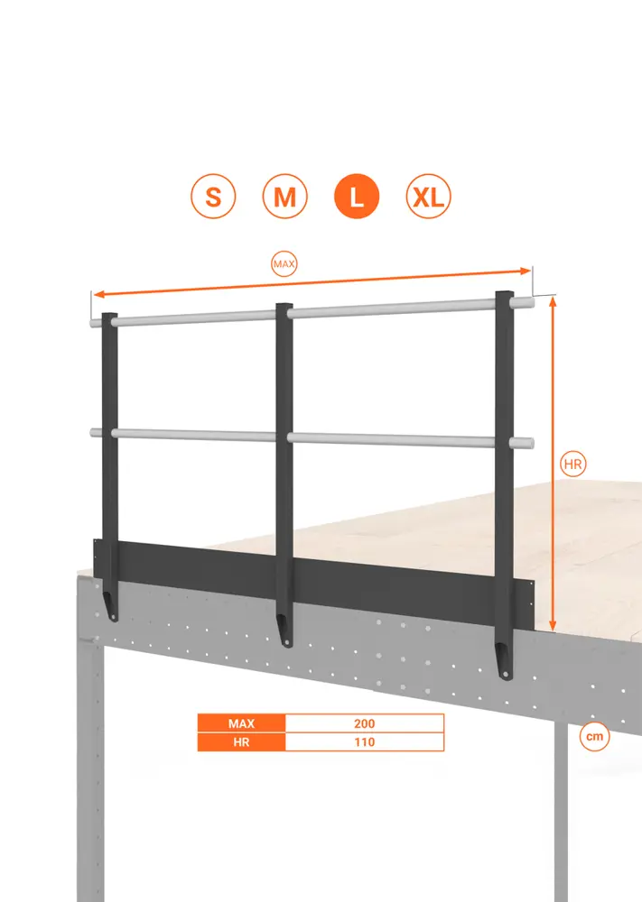 Balaustra di protezione perimetrale dotata corrimani orizzontali e fermapiede a terra. Facile da installare, altezza metri 1,10 - lunghezza metri 2. Per soppalchi S, M, L, XL