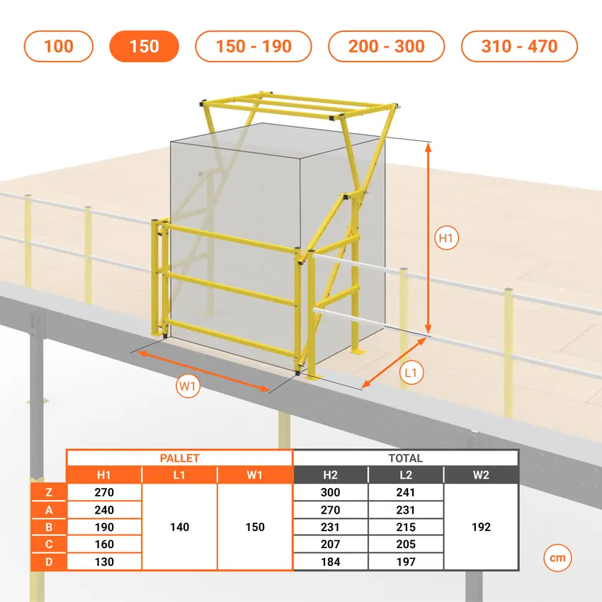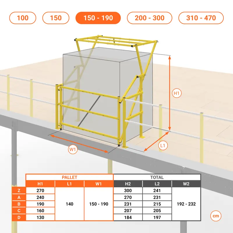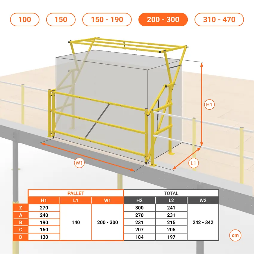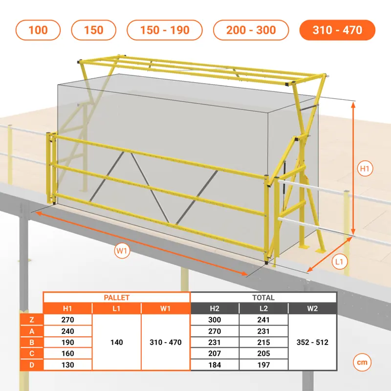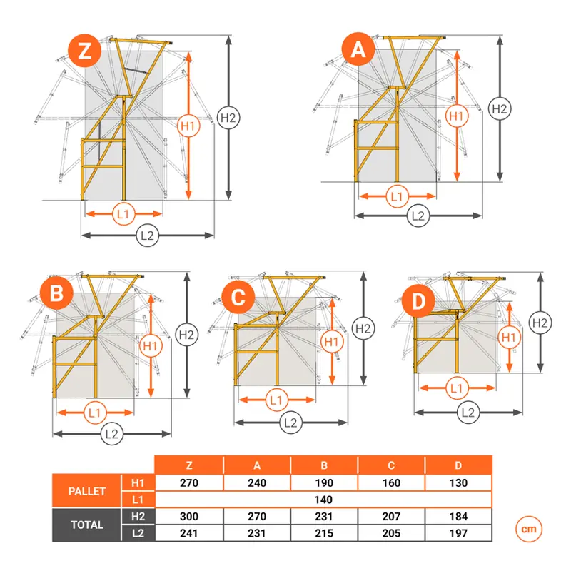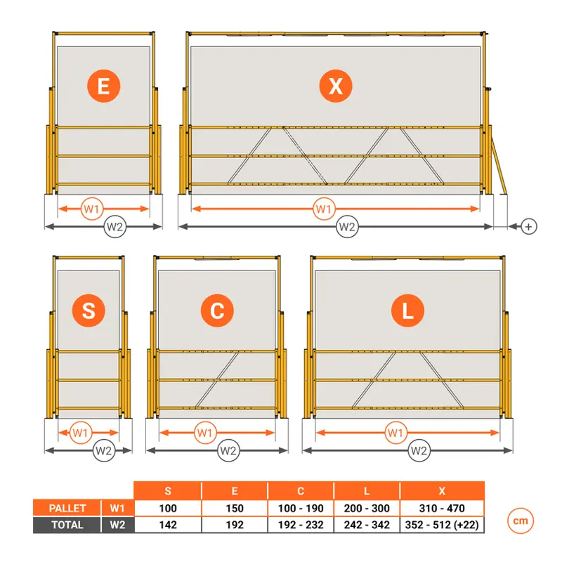 Per i 5 modelli visti fino a qui, a seconda del tipo di misure richieste del pallet sono disponibili 5 misure di altezza e profondità della barriera basculante.