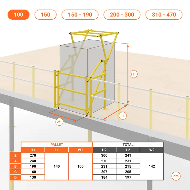 - Progettata per l'utilizzo in strutture industriali, consente di movimentare carichi pesanti dal piano inferiore del soppalco a quello superiore e viceversa, in totale sicurezza.