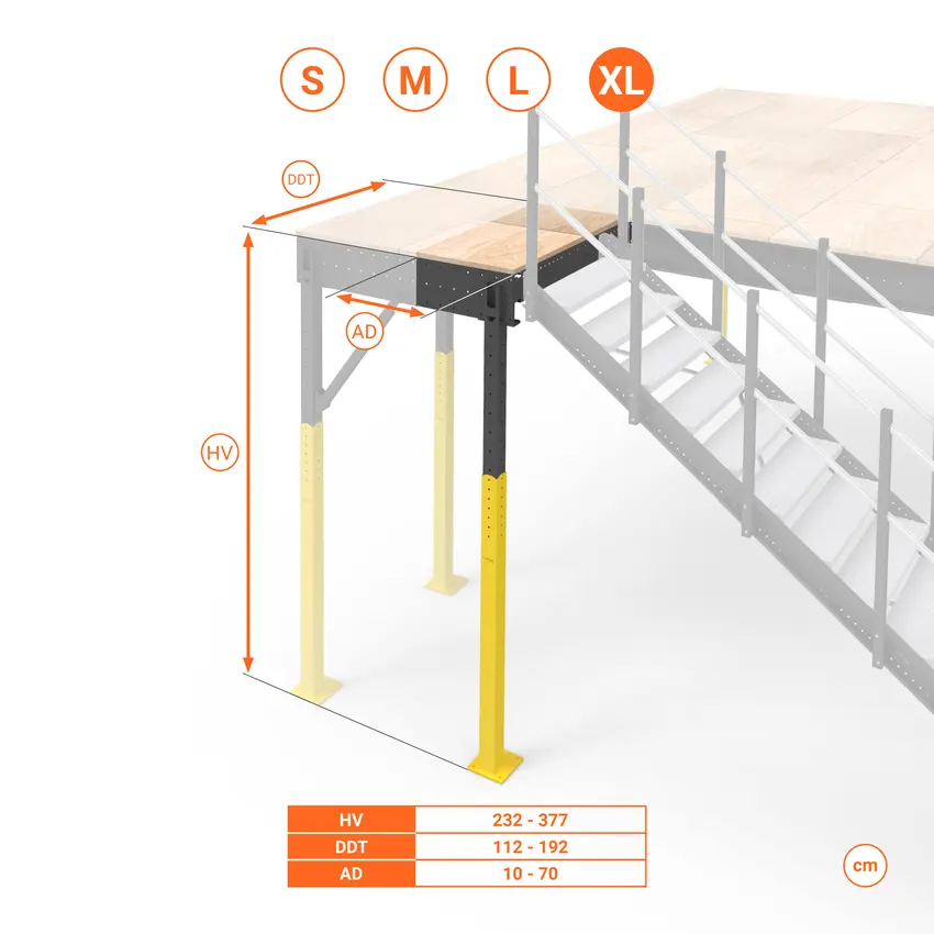 Le scale sono regolabili in altezza, quindi sono compatibili con qualsiasi soppalco Svelt e altre superfici, a condizione che l'altezza di salita corrisponda a quella del soppalco a cui devono essere ancorate.