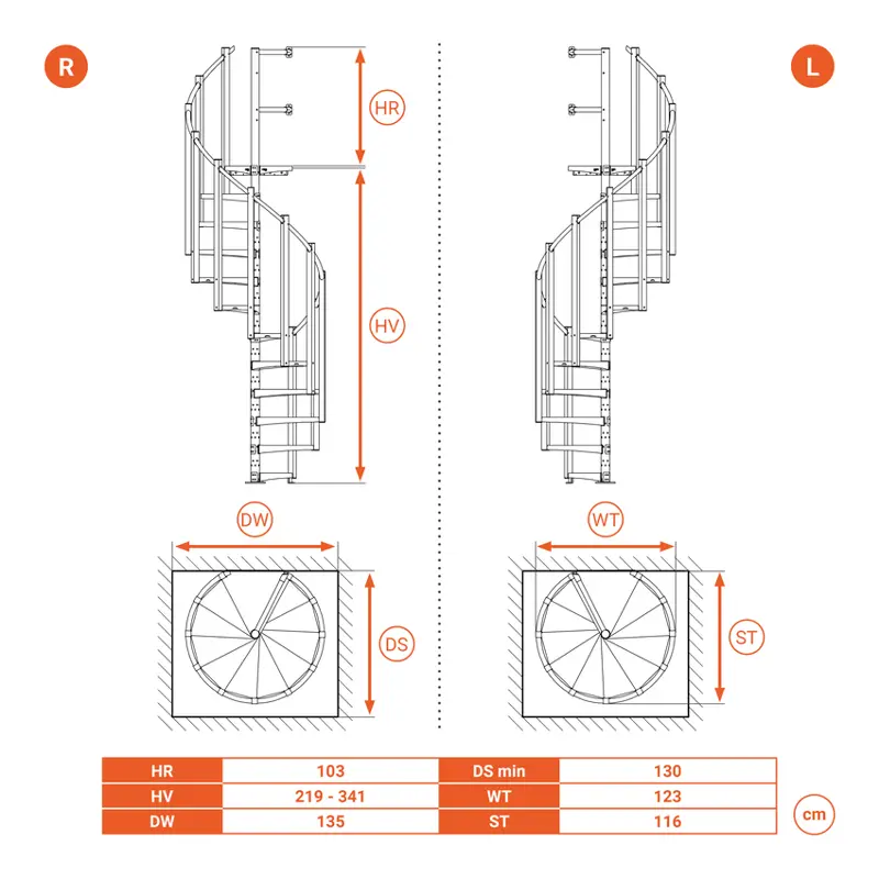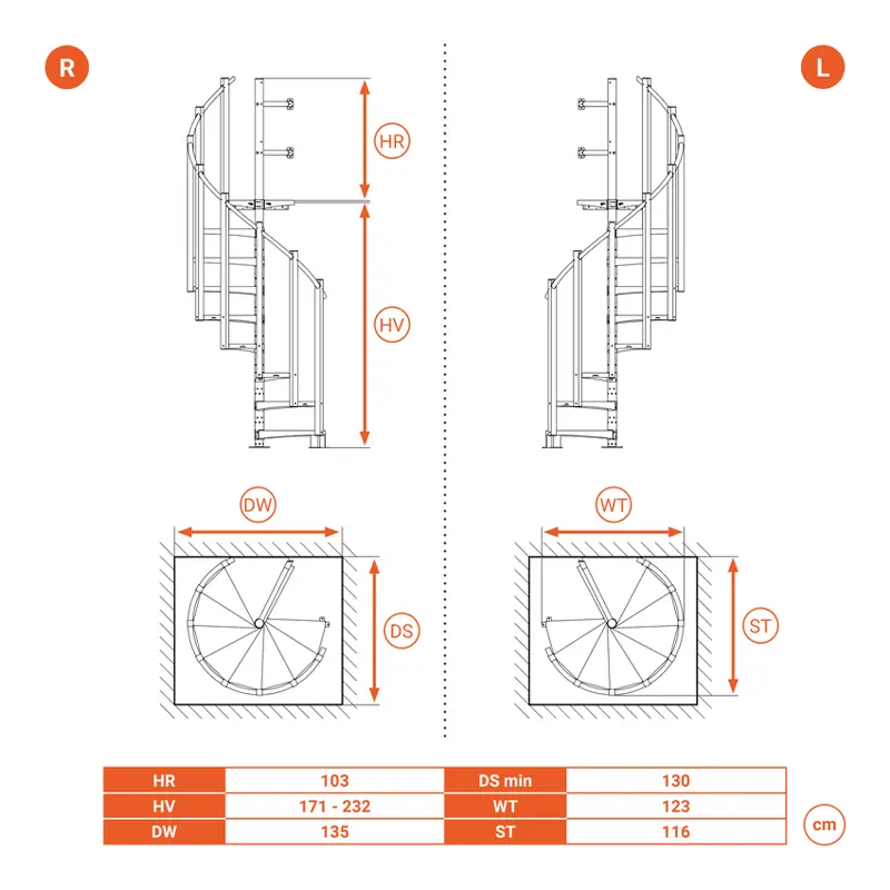 - Altezze disponibili sopra le travi (cm) (HV): 171, 177, 183, 189, 195, 201, 207, 213, 219, 225, 232