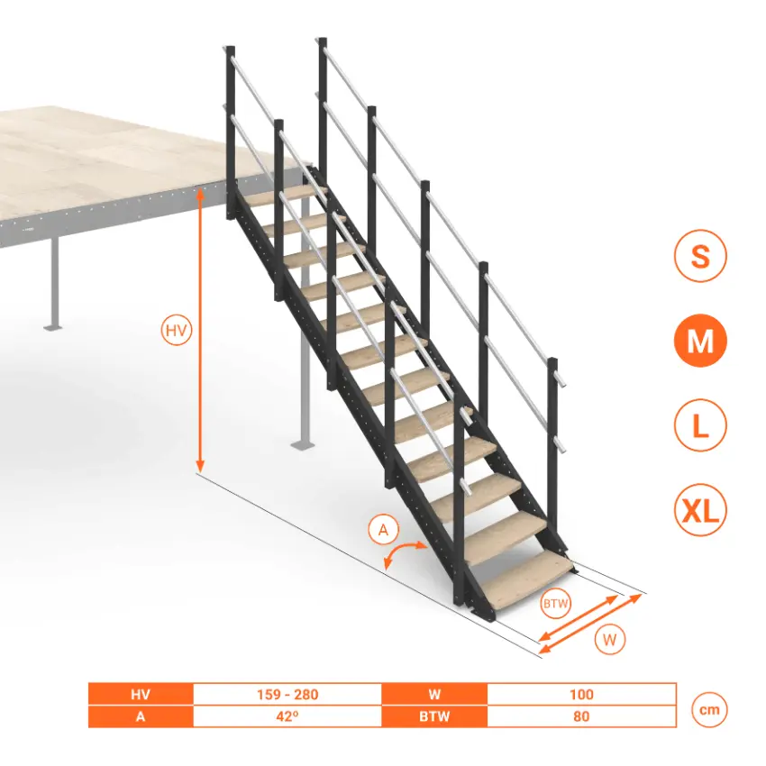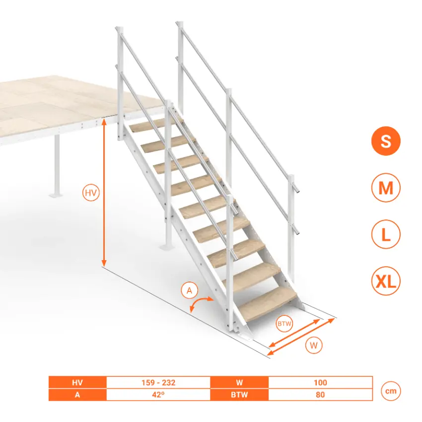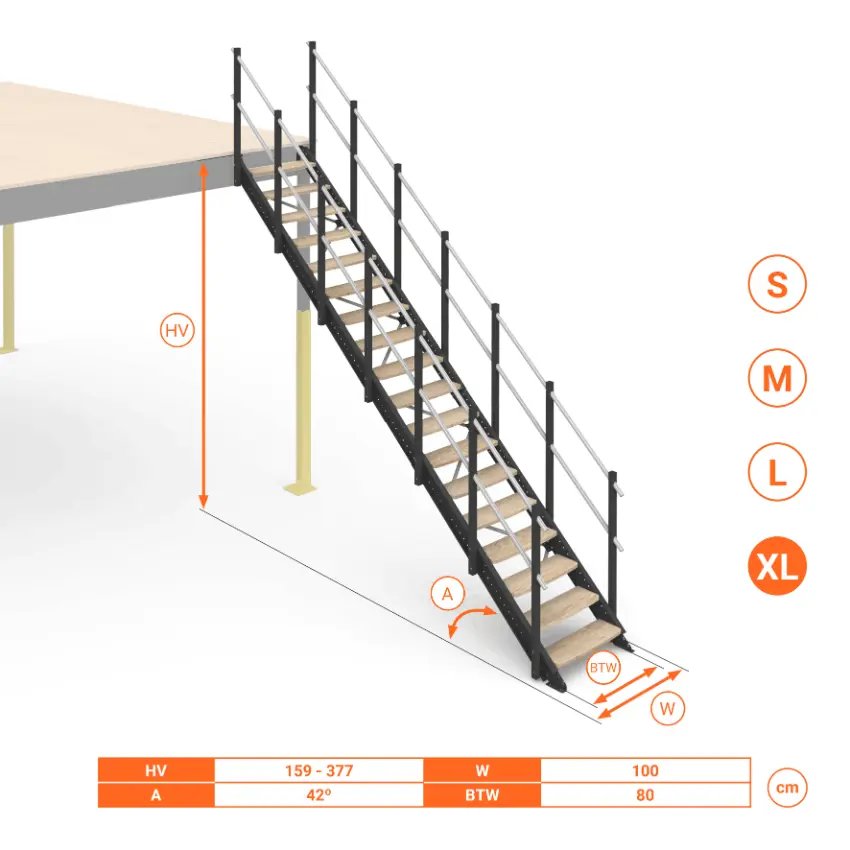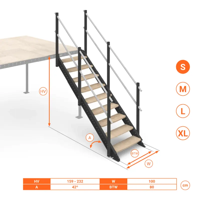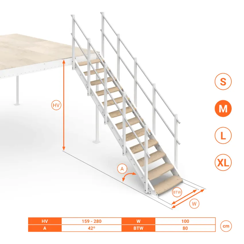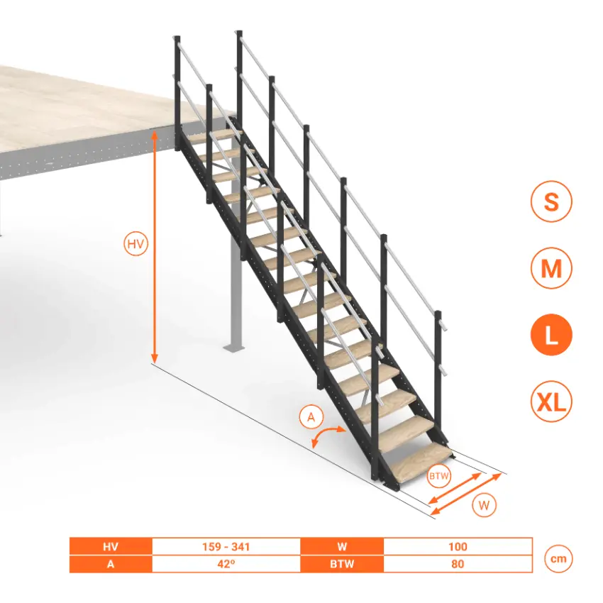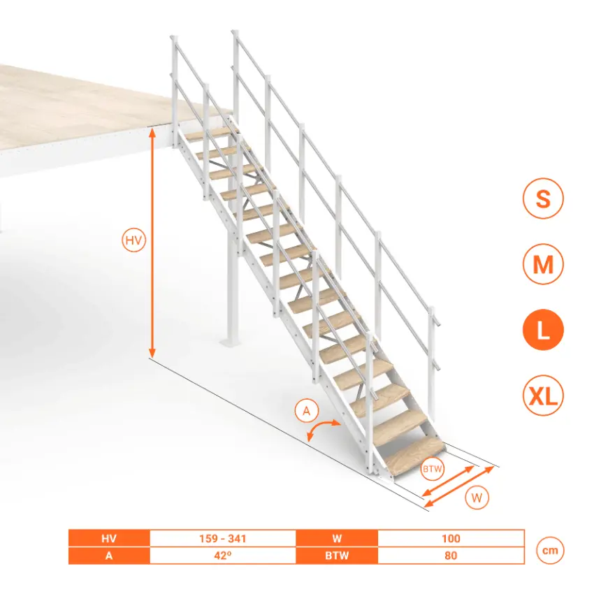 Scala per soppalchi Small, Medium, Large, Extra Large. Telescopica e regolabile con inclinazione 42°. Gradini in Legno.