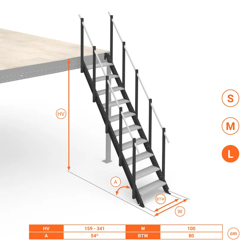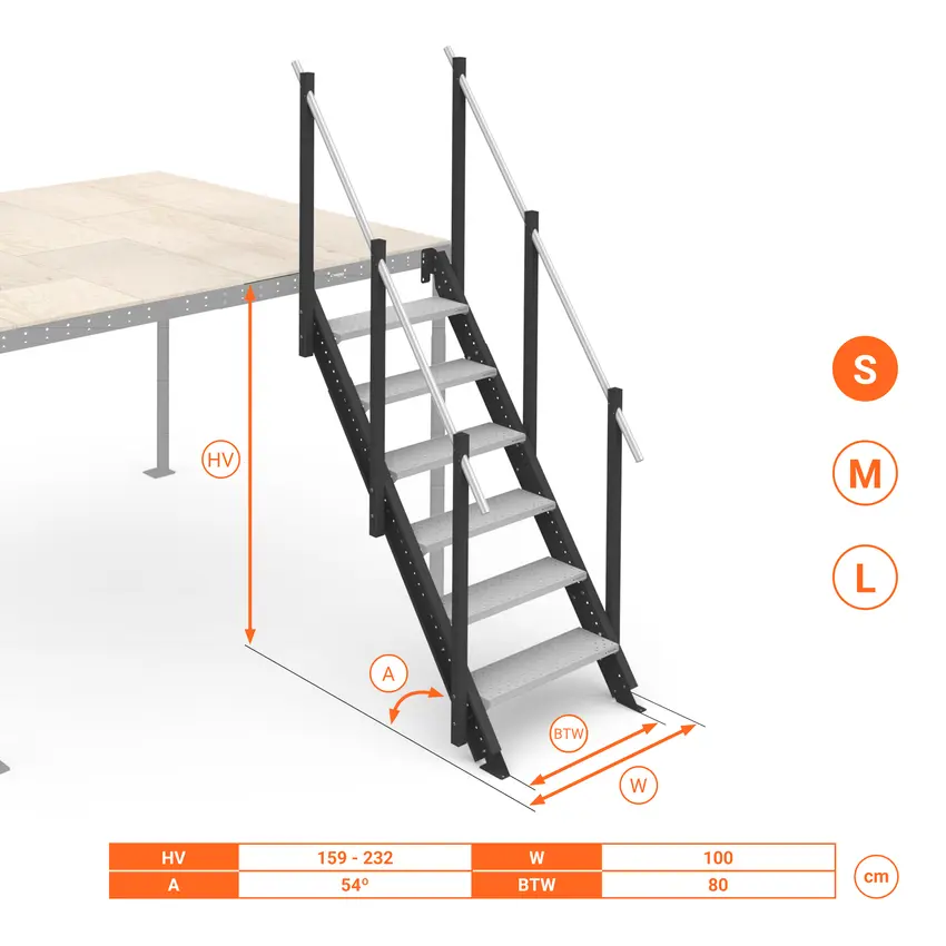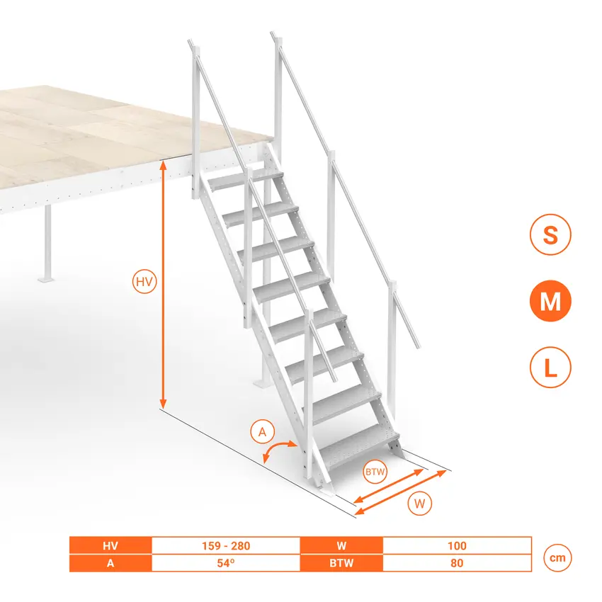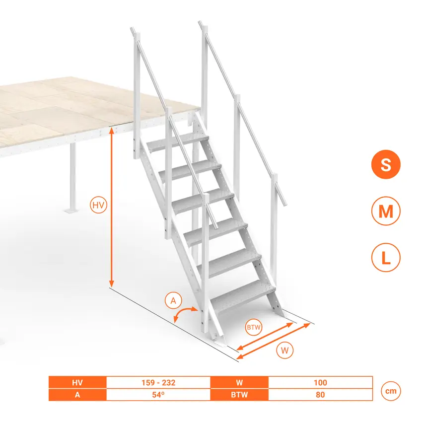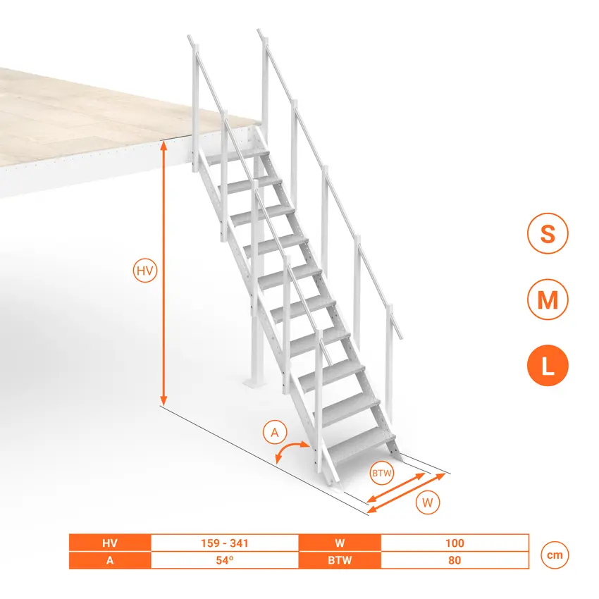 Scala per soppalchi Small, Medium e Large. Telescopica e regolabile con inclinazione 54°. Gradini drenanti in lamiera di acciaio verniciato