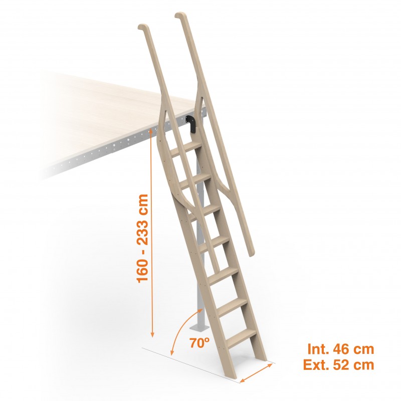Scala realizzata in legno di faggio di alta qualità verniciato con olio di lino che gli da un aspetto naturale, proteggendo la superficie del legno. E' regolabile in altezza in base all'altezza del soppalco. Sui montanti sono presenti delle tacche per il taglio a misura nel caso si debba accorciare la scala per adeguarla all'altezza del soppalco. Quando l'altezza della struttura è uguale o inferiore a 233 centimetri, la scala può essere facilmente adattata tagliandola lungo le tacche segnate sui montanti. Può essere installata su entrambi i lati della struttura, o addirittura all'interno. Viene fornita completamente assemblata.