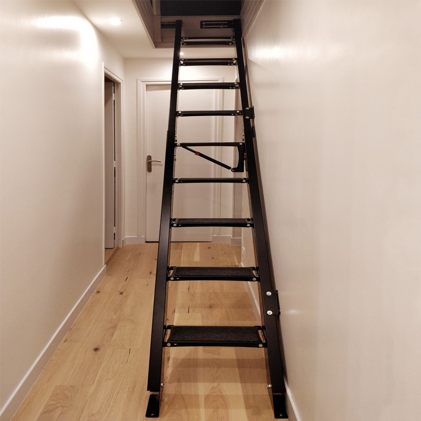 Scala comoda salvaspazio di acciaio si richiude contro il muro lasciando lo spazio di passaggio libero.