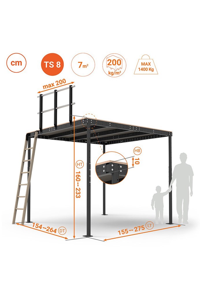 - Kit balaustra su richiesta a 4 tubi altezza 80 cm per utilizzo come soppalco basso (es. ripostiglio per il garage) o soppalco d'arredo (es. per il letto)