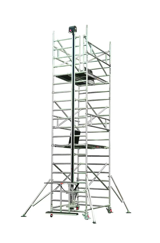 Tempo Shuttle è un trabattello in alluminio TEMPOTECH L da m 1,35 x m 2,00/2,50 o 3,00 dotato di un sistema di sollevamento per pannelli di ogni tipo (principalmente strutturato per pannelli fotovoltaici.