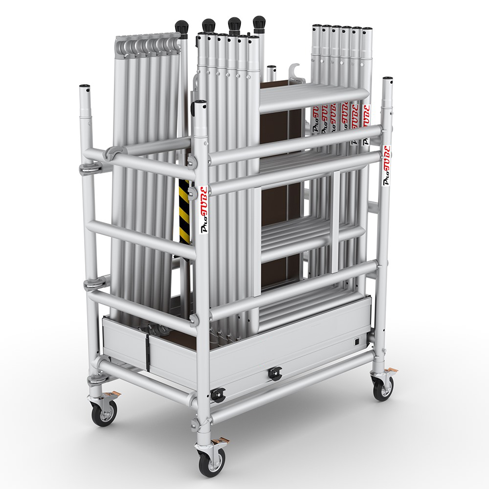 Una volta scaricato il modulo base diventa un carrellino in grado di trasportare sul luogo di lavoro tutti i componenti necessari per il montaggio alla sua massima altezza.