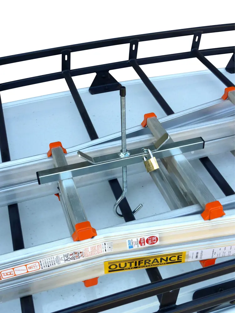 Ladderslothaak voor bagagerekken: eenvoudig te monteren, hij vergrendelt de ladder op de imperiaal van de auto of bestelwagen zonder dat deze hoeft te worden vastgemaakt met vervelende, luidruchtige en onveilige riemen.