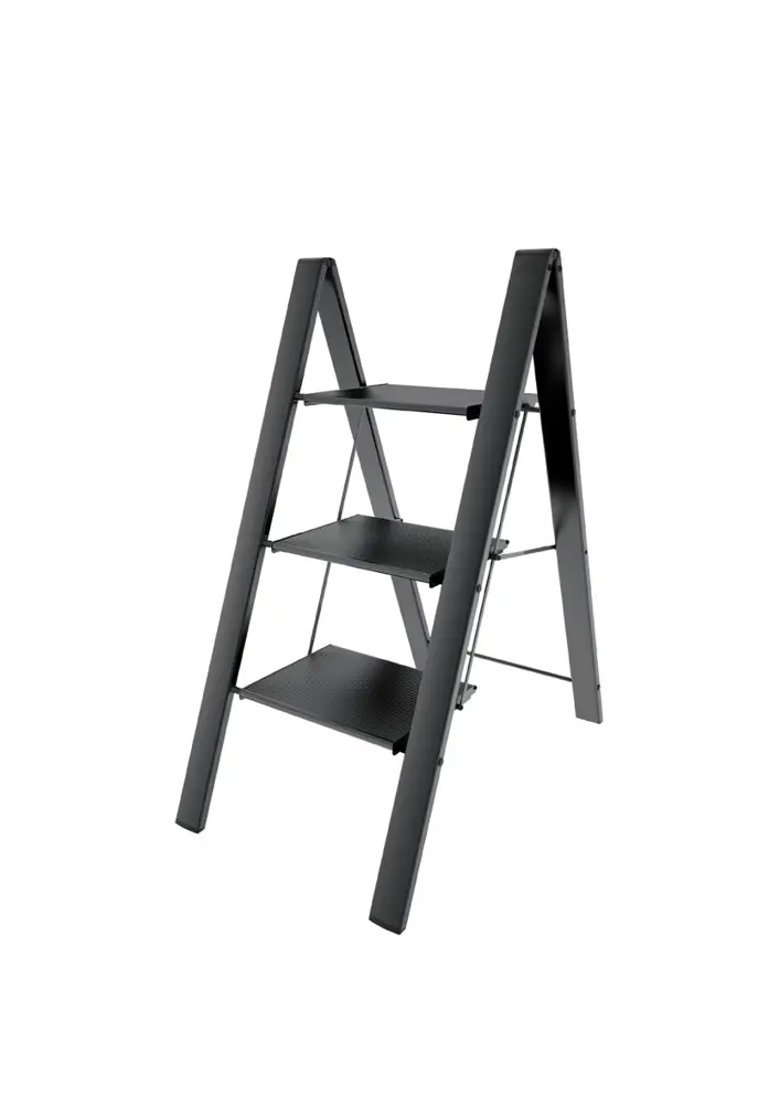 Zeer dunne en compacte kruk in zwart geanodiseerd aluminium, perfect voor gebruik in huis, kantoor of winkel.