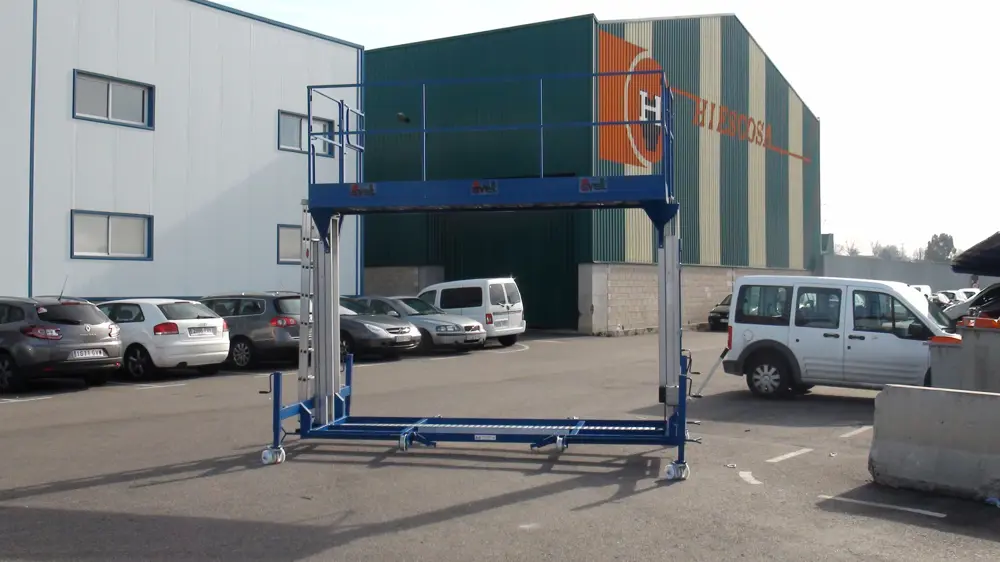 Verstelbaar telescopisch platform dat op rails kan schuiven. Pneumatische elevatie.