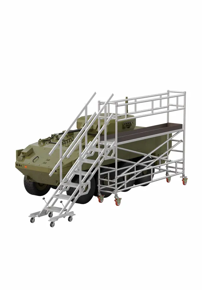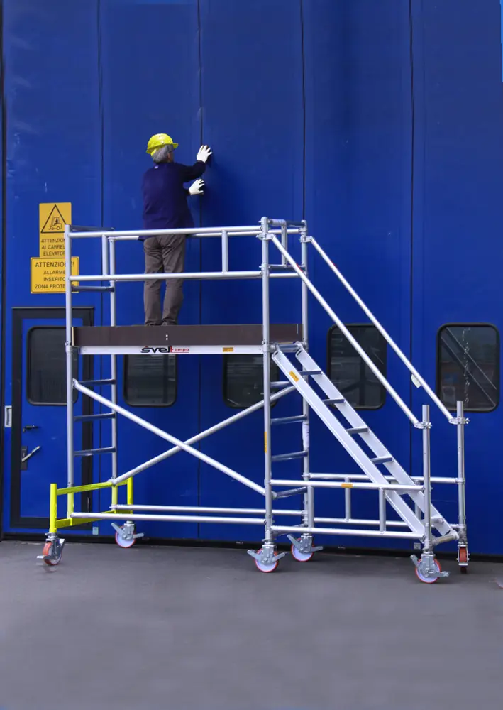 Versie van de TEMPOTECH-steiger met de toevoeging van een comfortabele geïntegreerde ladder die de operators volledig comfortabel toekunt.