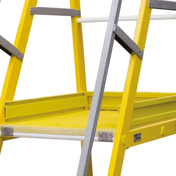 Ladder van 100% glasvezel met 2 wielen, 2 armleuningen en platform van 60,5x80,5 cm voor voedings- of chemische bedrijven. Naar de Europese normen EN131.7