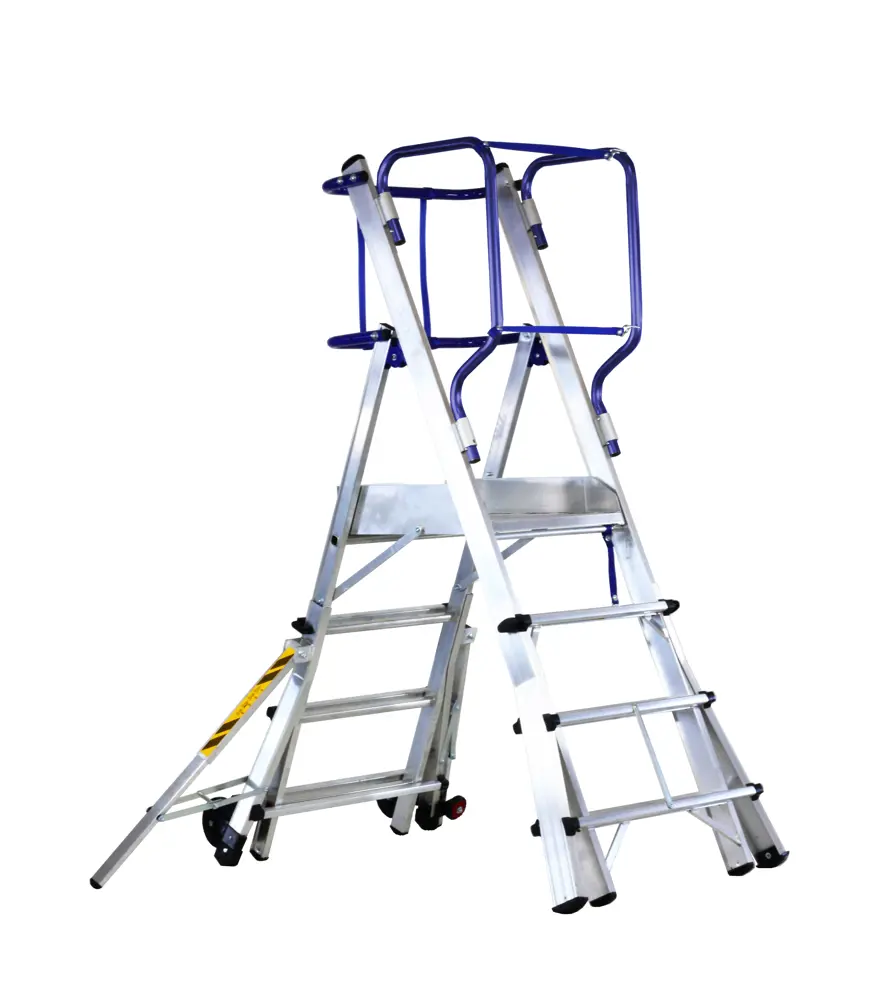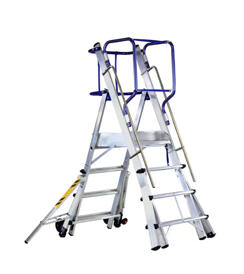 Deze platformladder is in overeenstemming is met de nieuwe Europese normen UNIEN131/7 en combineert alle functies van een telescopische ladder met die van een mobiele magazijnuitzettrap, heeft vele mogelijkheden om te manoeuvreren, draagbaarheid en veiligheid die niet kan worden gevonden bij andere modellen.