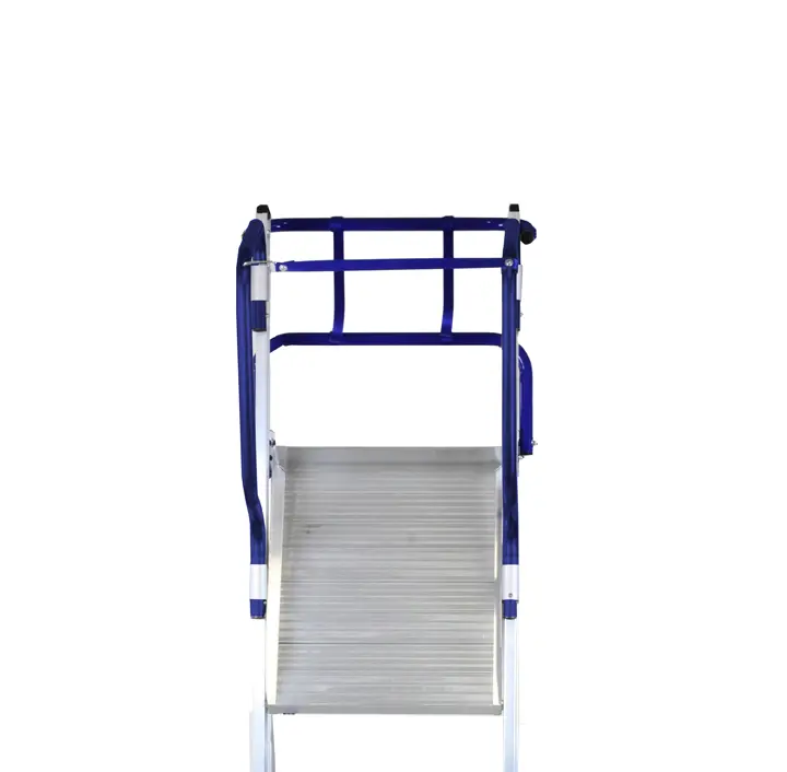 - Versterkt antislip aluminium platform (60 x 53 cm) met openingsbeveiligingssysteem en 5 cm hoge kantplank
