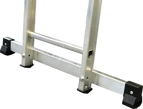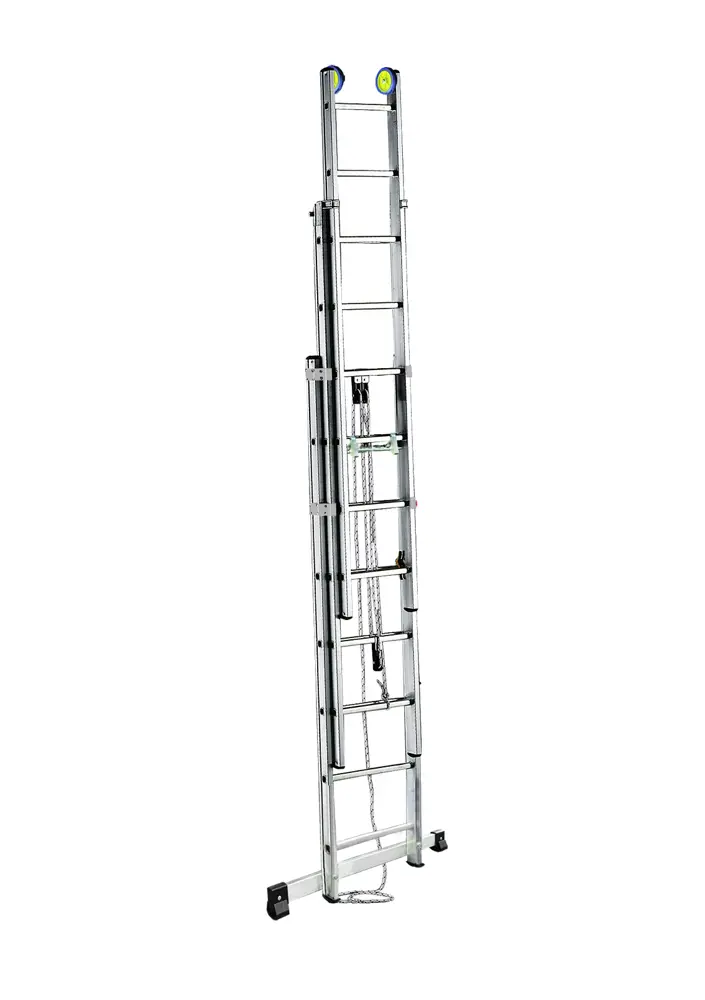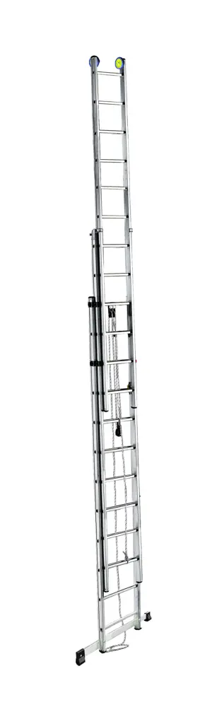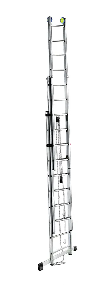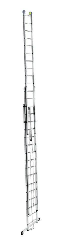 Uitschuifladder in 3 secties ontwikkeld met een kabelmechanisme, 3e sectie met handmatig uitschuifbaar, voetverbreding. Voldoet aan de Europese EN131