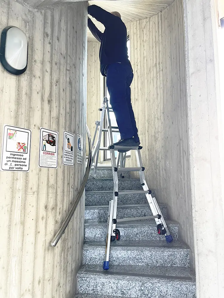 Het kan zowel als steunladder als als dubbele of lamme ladder worden gebruikt.