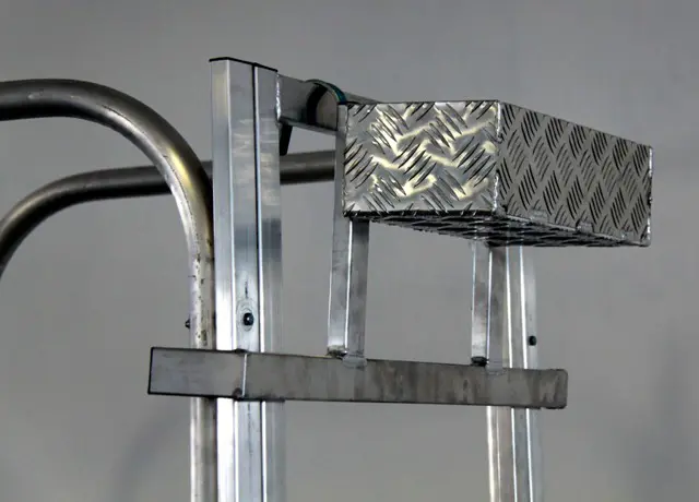 Enkelzijdige ladder met platform (60 x 80 cm), vangrail en leuning (optie). Deze is gemaakt van geëxtrudeerd geribbeld aluminium van hoekprofiel.
