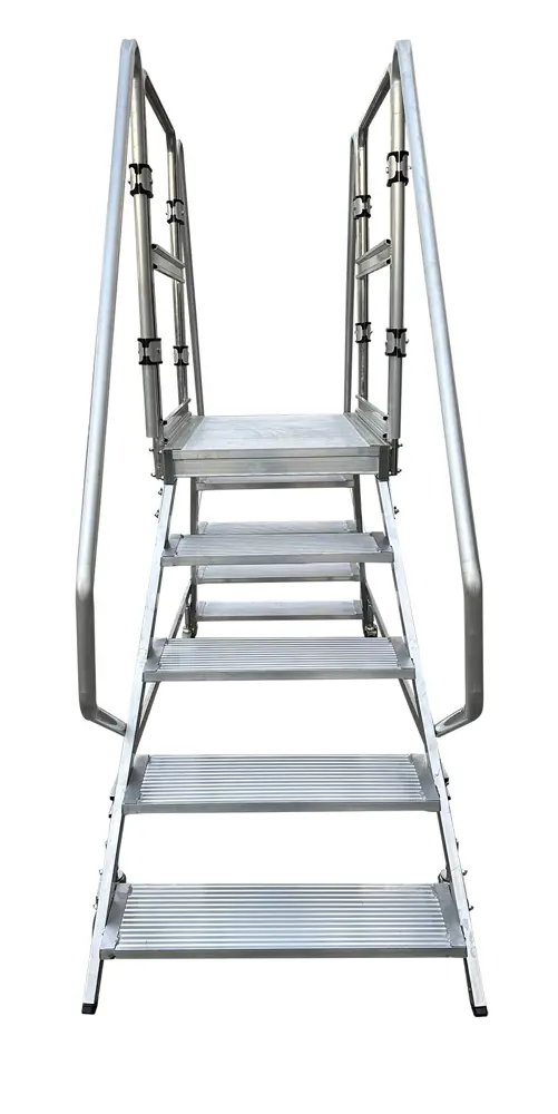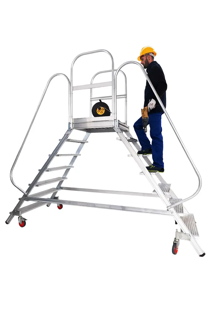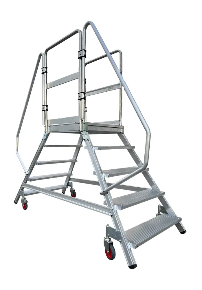 Dubbelzijdige ladder met platform (60 x 80 cm), reling en leuning (optie) gemaakt van geëxtrudeerd geprofileerd aluminium profiel.
