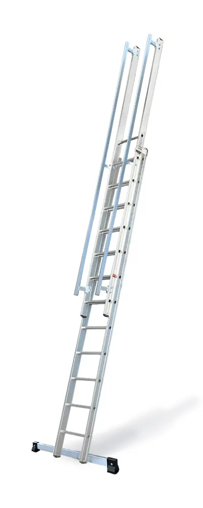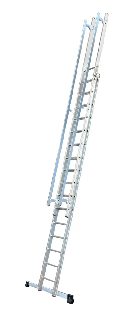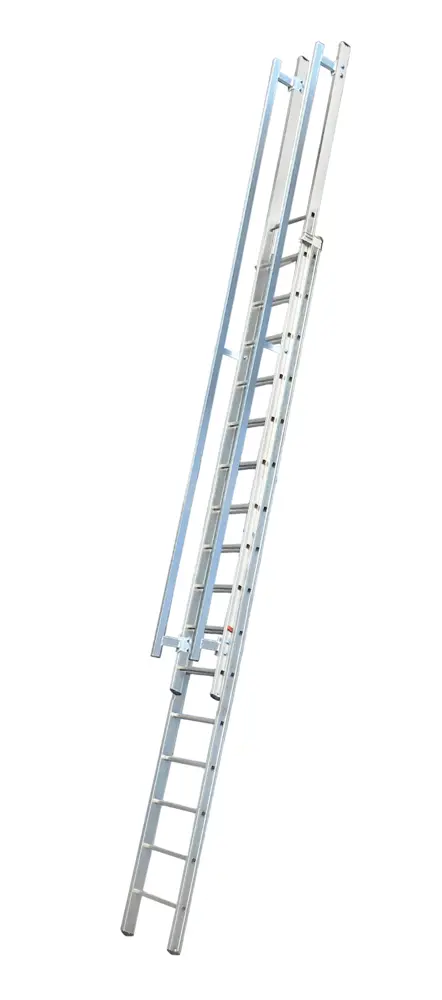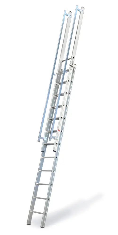 Tweedelige telescopische ladder voor toegang tot daken, mezzanines en mezzanines. Het wordt gekenmerkt door de bescherming van het bovenlichaam dat 1 m boven de laatste trede uitsteekt, zodat operators veilig van boord kunnen gaan.