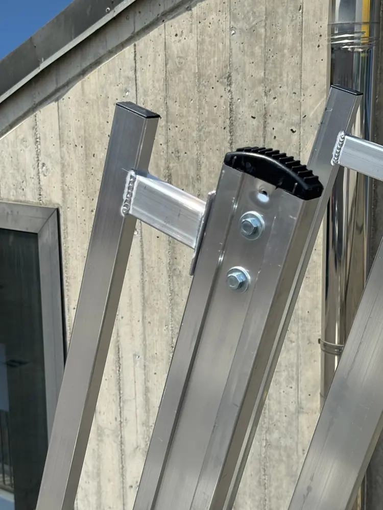 Het heeft zich ook gericht op robuustheid omdat het aanzienlijke hoogten bereikt (5 en 7 m). Het profiel van de staanders meet dus 84 x 27 mm. Op verzoek kan de ladder worden uitgerust met een stabilisator aan de basis, om hem meer stabiliteit te geven en de veiligheid te verbeteren, en een leuning voor een betere grip van de operators bij het betreden van de vloer van bovenaf.