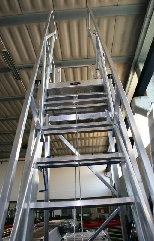 Окрашенная стальная рама поддерживает ребристую алюминиевую лестницу с платформой, оснащённой парапетами со всех сторон и (по запросу) передними или боковыми посадочными воротами.