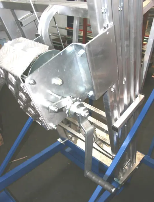 Её можно поднимать и опускать с помощью ручной лебёдки, оснащённой стальной верёвкой. Механический предохранительный замок обеспечивает двухкрючный запирающий замок (трос всегда разряжается от веса лестницы).