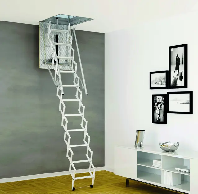 Оцинкованная стальная лестница с 11 ступенями, открывающаяся как аккордеон.