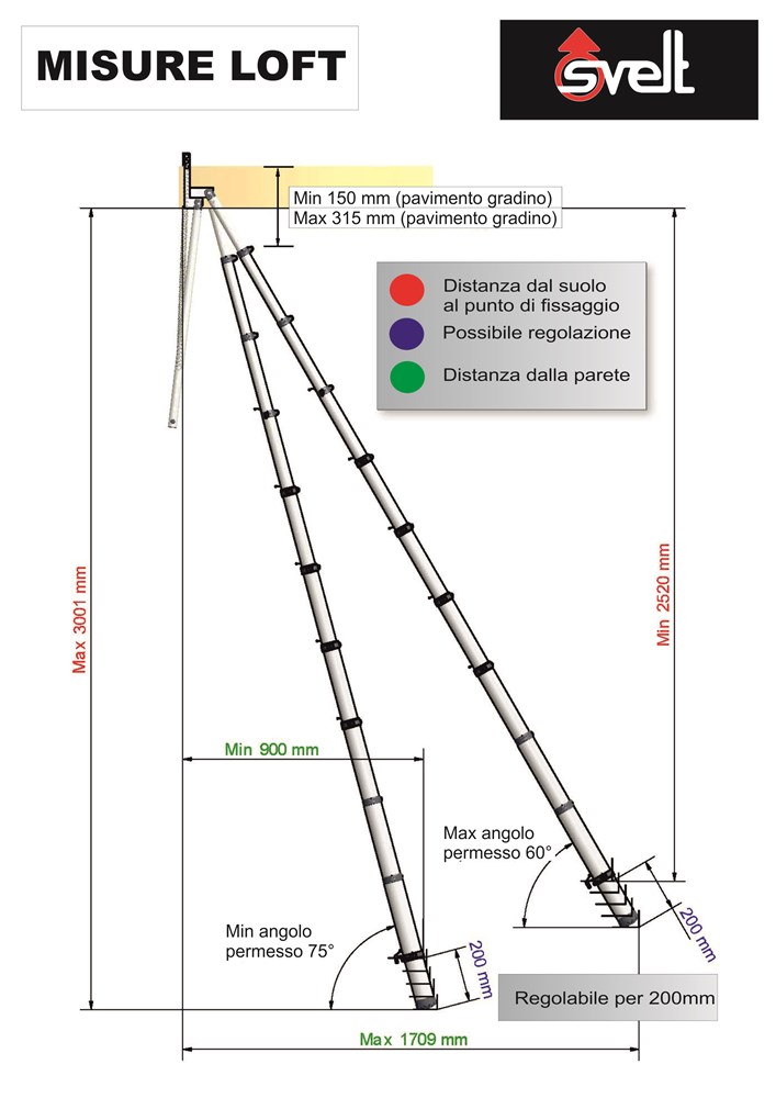 Выдвижная лестница Loft изготовлена из анодированного алюминия с 10 ступеньками и регулируется для высоты от 2,55 м до максимальной высоты потолка 2,95 м, а также для использования в помещении.