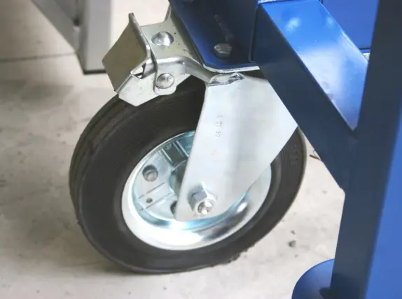 - Основная конструкция (рама) выполнена из окрашенной стали с четырьмя цельными поворотными колёсами диаметром. 200 мм с ножным тормозом