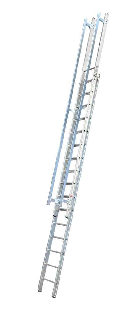 Двухсекционная телескопическая лестница для доступа к крышам, мезонинам и мезонинам. Он характеризуется защитой верхней части тела, выступающей на 1 м над последней ступенькой, чтобы операторы могли безопасно высадиться.