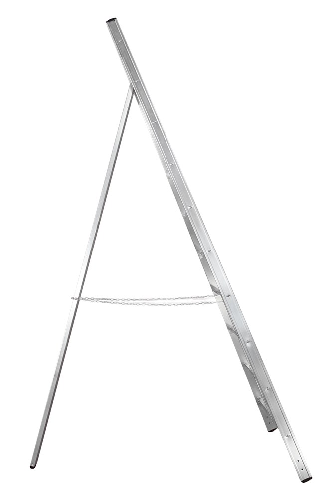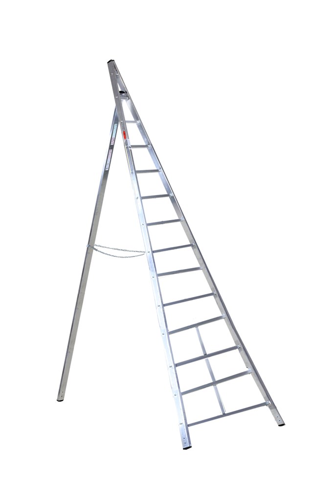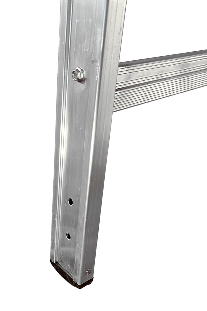 Изготовлена из экструдированного ребристого алюминия со сходящимися вертикальными стойками и колонной, что позволяет использовать лестницу в положении стремянки.