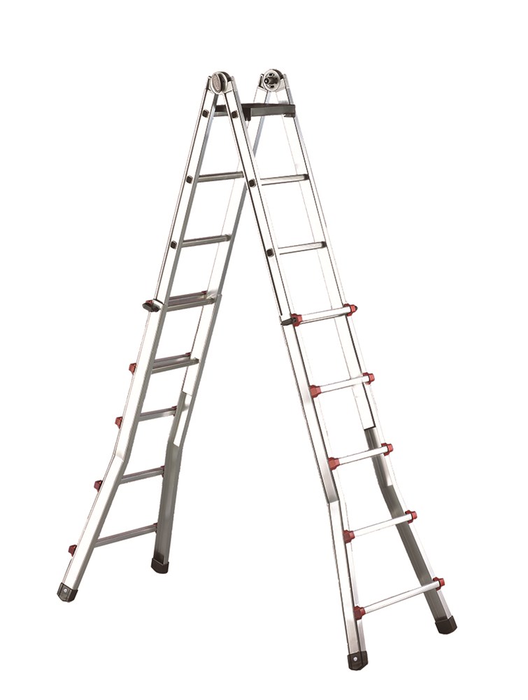 2) зафиксировать разложенную лестницу в положении «стремянки» при помощи шарнира