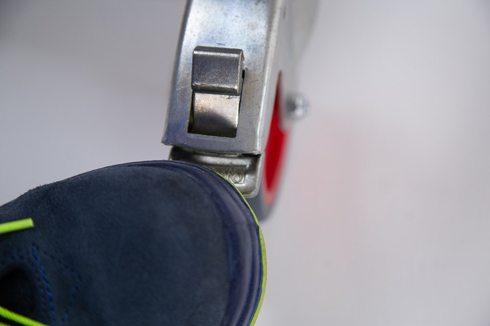 Когда оператор поднимается по лестнице, пружинная система удерживает лестницу на резиновых ножках, фиксируя ее для работы. Ножный тормоз на 2-х из 4-х колес делают лестницу еще более устойчивой. После спуска оператор может откатить лестницу на 4-х колесах к рабочему месту.