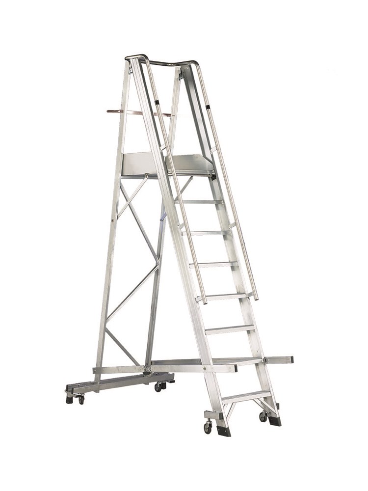 Данная лестница изготовлена из экструдированного алюминия, имеет 4 ролика диаметром 80 мм, позволяющих перемещать лестницу посредством лёгкого толчка.