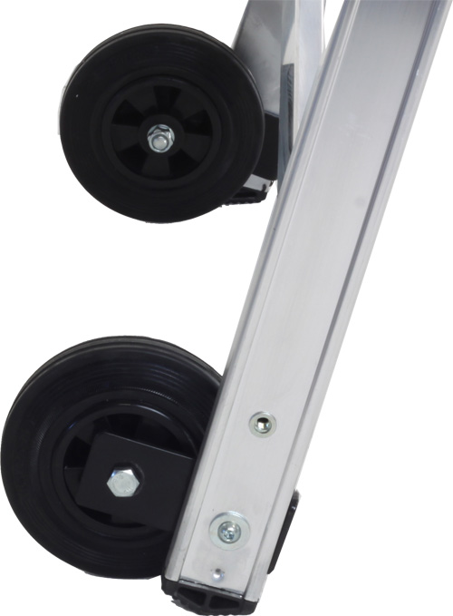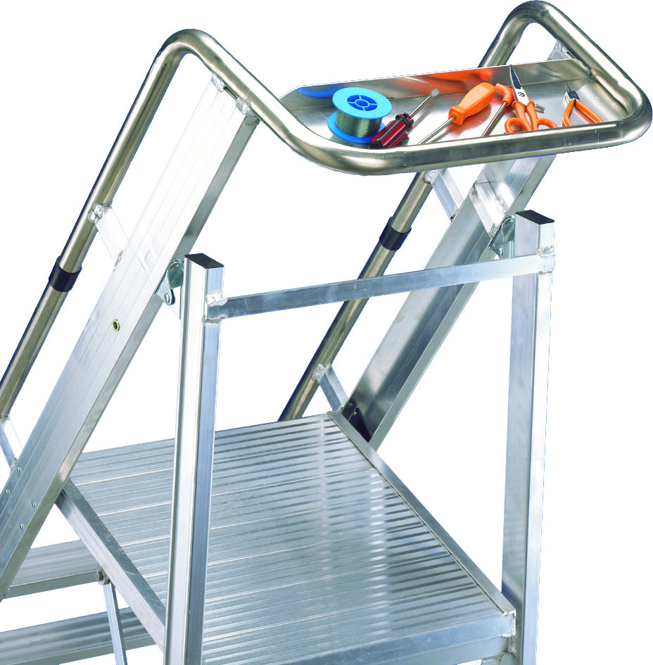 Односторонняя алюминиевая лестница с большой платформой, оснащенная двумя роликами, лотком дл инструмента и перилами.