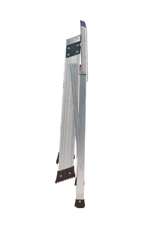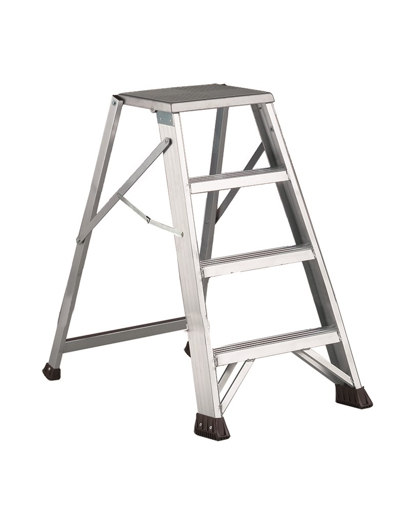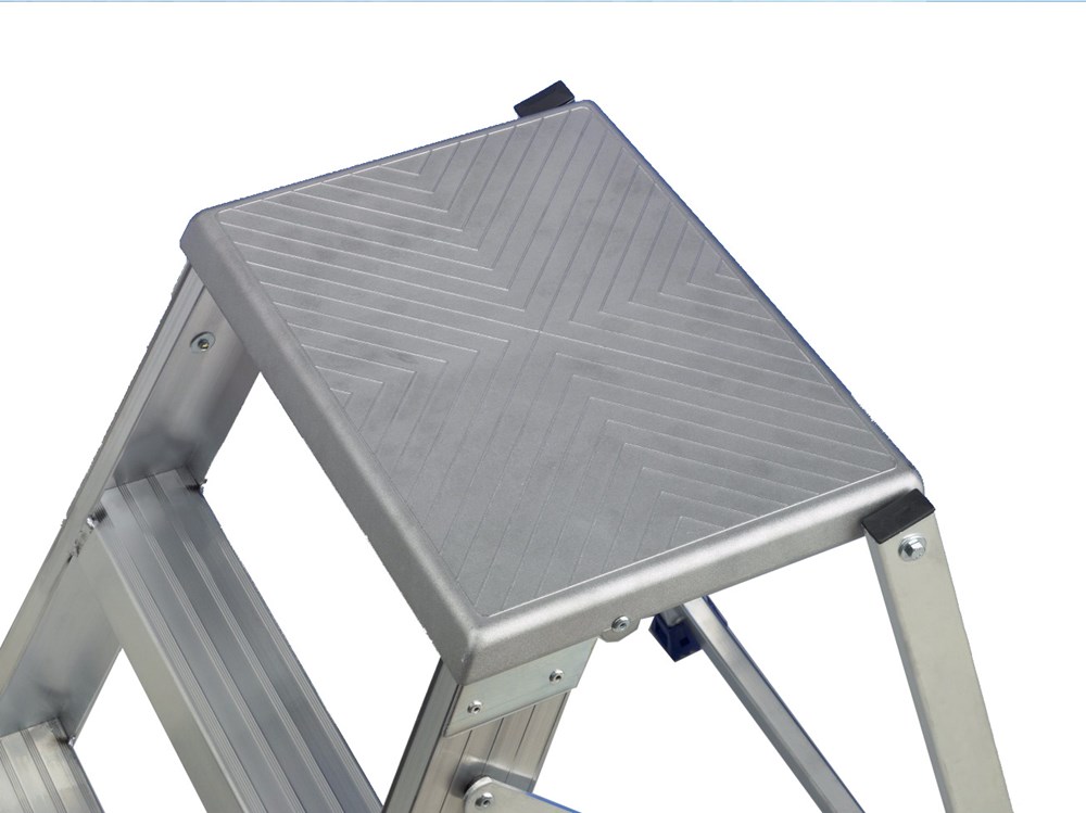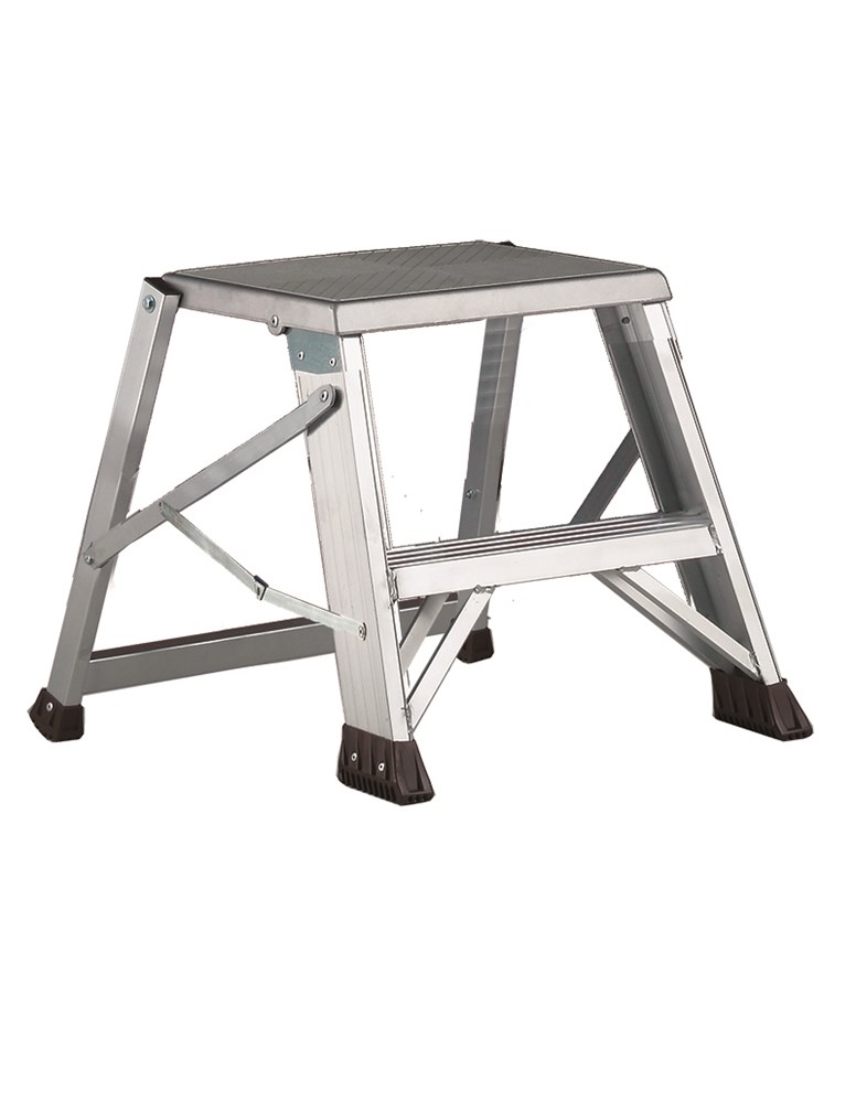 Оснащена большой, прочной, удобной, нескользящей алюминиевой платформой. Конструкция имеет чрезвычайно широкую опору, которая предотвращает скольжение и опрокидывание стремянки-табурета, даже когда оператор ставит ноги на край платформы. Двойная система защиты от случайного раскрытия, состоящая из алюминиевых стяжек и автоматически защелкивающейся площадки.