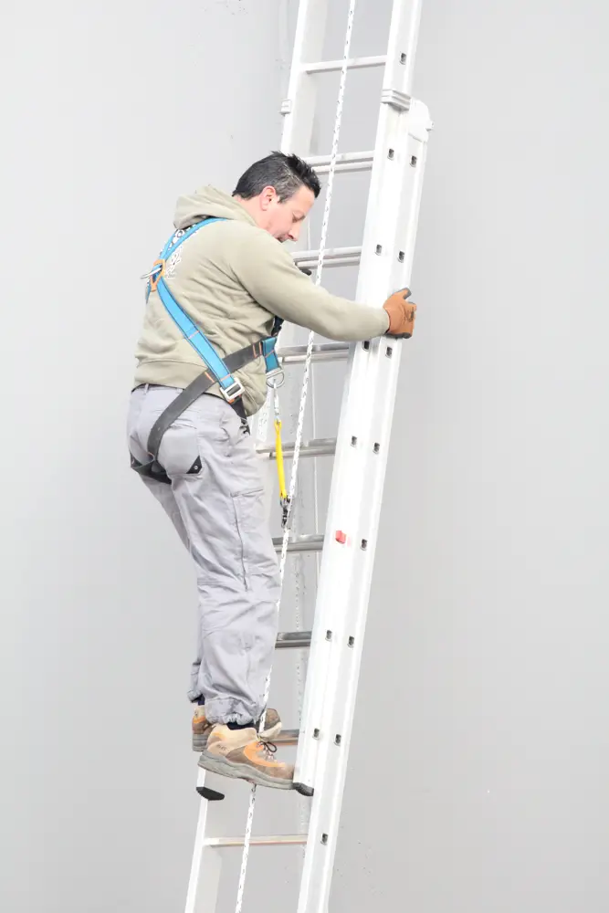 - Оператор с 2-точечным ремнем, подключенным к СИЗ, теперь сможет подниматься по лестнице в полной безопасности