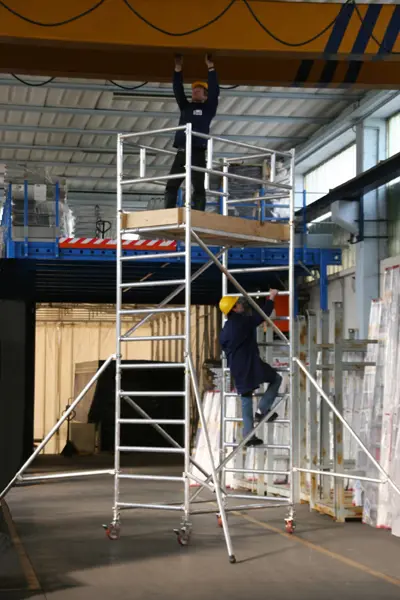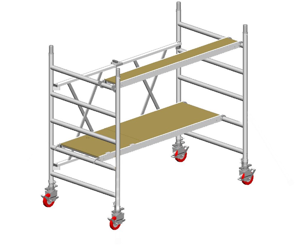 - Модуль A: 2 рамы (5 ступ.), 2 диагонали, 2 горизонтали, 4 колеса с тормозом Ø 150 мм с регулируемыми ножками (30 см), 1 платформа с люком, 1 платформа без люка.
